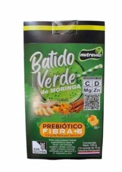 El Batido Verde de Moringa Prebiótico Fibra+6 de Nutrevia es un suplemento en polvo diseñado para promover la salud digestiva, actuando como un potente antioxidante y antiinflamatorio natural. Cada sachet (12g) contiene solo 8 kcal, siendo una opción baja en calorías, sin azúcar que combina moringa, cúrcuma, jengibre y canela, ideal para la saciedad y el bienestar diario